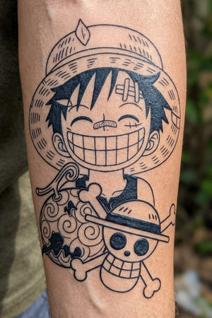 Where it all began. This charming design features a joyful Luffy alongside the Gomu Gomu no Mi (Gum-Gum Fruit) and the Straw Hat Jolly Roger. It captures the innocence, the bandages of training, and the fated bite that changed history. A nostalgic and "kawaii" yet cool addition to your tattoo collection.